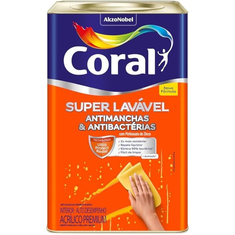 Coral Super Lavável Antimanchas & Antibactérias é uma tinta acrílica de alto desempenho e alta durabilidade para ambientes internos, que agora conta também com ação antibactéria e antimofo. Possui a inovadora Tecnologia Ultra Protect Resist, Coral Super Lavável é 2x mais resistente1 à limpeza, repele líquido, e elimina 99% das bactérias da parede e acaba com mofos. Seu acabamento Eggshell/Semiacetinado tem um nível de brilho intermediário entre o fosco e o acetinado, o que ajuda a disfarçar as imperfeições da parede. Sua nova fórmula foi especialmente desenvolvida para entregar o desempenho superior em limpeza de manchas de chocolates, ketchup, café, refrigerantes, sucos, lápis, caneta hidrográ?ca, lápis de cor e batom, além de ter ação antibactéria e antimofo. Renove sua casa com Coral Super Lavável e deixe suas paredes bonitas, protegidas e com aparência de novas por muito mais tempo.