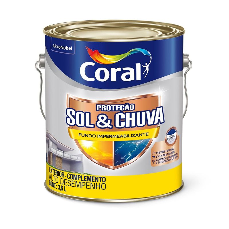 Proteção Sol & Chuva Fundo Impermeabilizante é um complemento indicado para quem quer proteger paredes externas e internas de casas, prédios e muros, faça sol ou faça chuva. Sua película flexível e impermeável permite acompanhar os movimentos de dilatação e contração das paredes, causados pelas mudanças do tempo, prevenindo fissuras e infiltrações de fora para dentro, além de aumentar a durabilidade e o rendimento da tinta.
