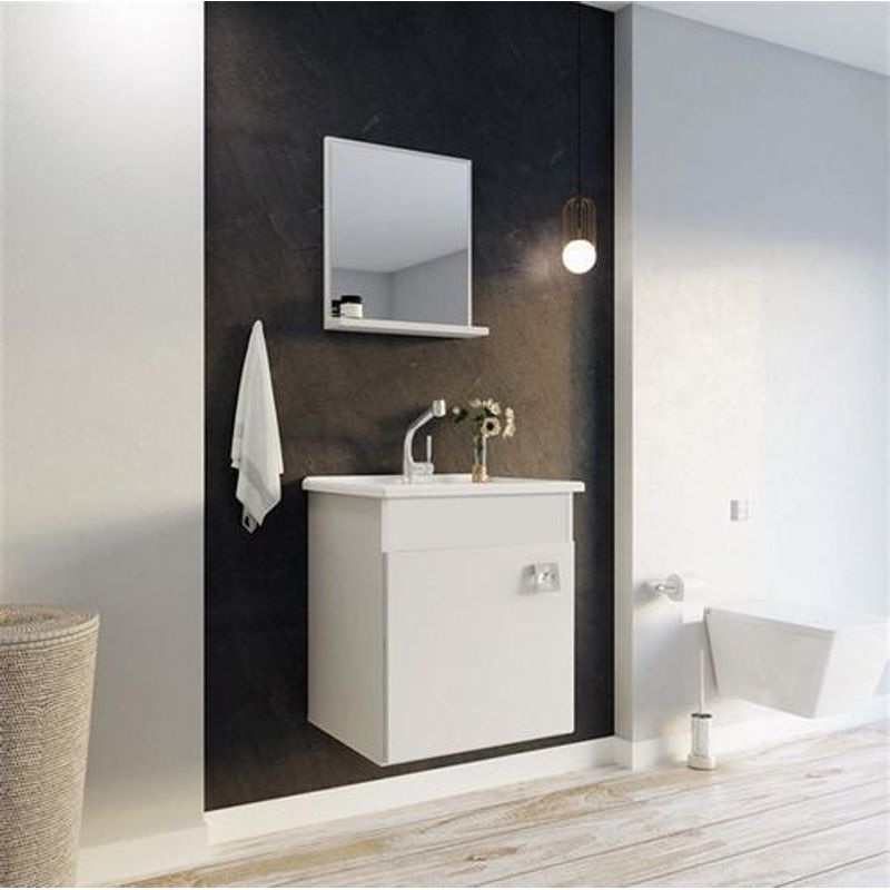 O kit é composto por um gabinete suspenso com porta, uma cuba em resina com design integrado e um quadro de espelho coordenado. Por ser um móvel suspenso, ele facilita a limpeza do piso e evita o contato direto com a umidade, prolongando a vida útil do material.