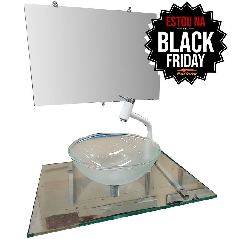 Diferente dos modelos coloridos, a versão incolor destaca a lapidação das bordas e a qualidade do vidro temperado. É um móvel suspenso que facilita a limpeza e não cria barreiras visuais, tornando o ambiente mais arejado e moderno.