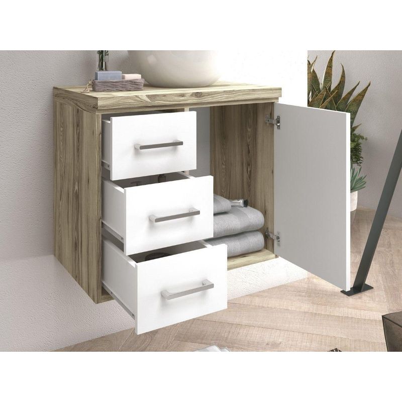 Com 60cm de largura, este gabinete oferece um espaço generoso de armazenamento e uma bancada ampla. O modelo é suspenso, o que otimiza o espaço do banheiro, facilita a higienização do piso e protege o móvel da umidade direta. Acompanha uma espelheira funcional que completa o design e auxilia na organização de itens diários.